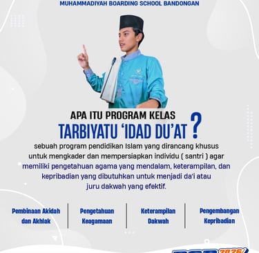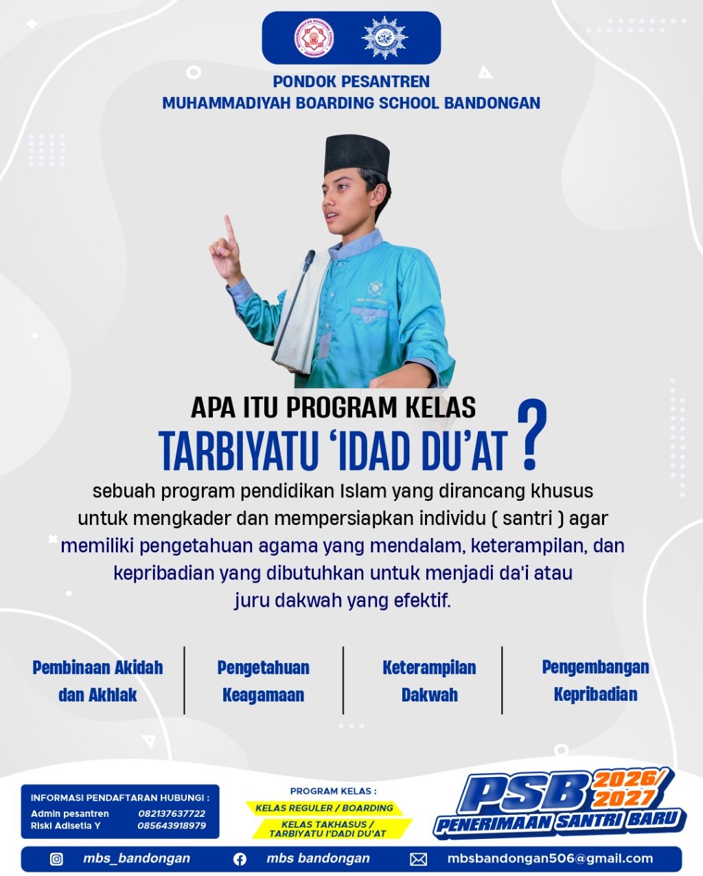 Di tengah tantangan zaman yang semakin kompleks, kebutuhan akan da’i yang tidak hanya berilmu tetapi juga memiliki akhlak mulia dan keterampilan dakwah yang baik menjadi semakin penting. Menjawab kebutuhan tersebut, Pondok Pesantren Muhammadiyah Boarding School (MBS) Bandongan menghadirkan Program Kelas Tarbiyatu ‘Idad Du’at, sebuah program pendidikan Islam khusus yang dirancang untuk mencetak kader da’i dan juru dakwah yang siap terjun ke masyarakat.